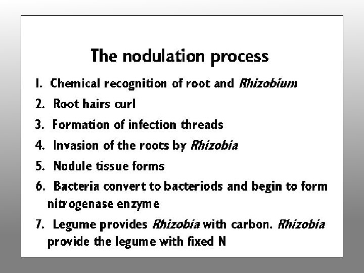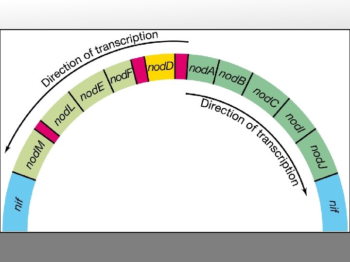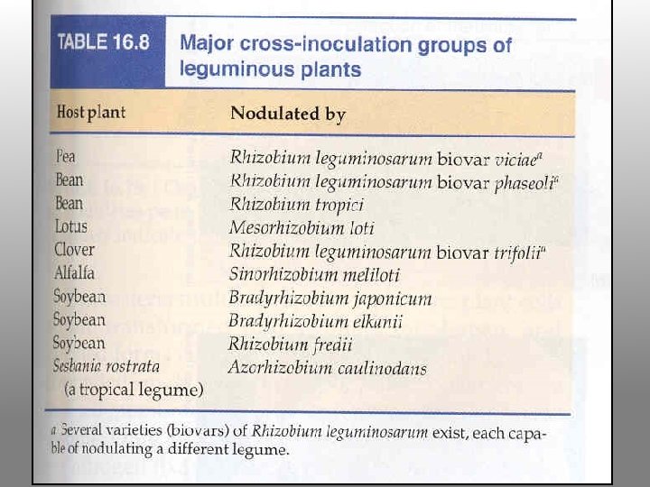 Rhizobium-legume symbioses Host plant Bacterial symbiont Alfalfa Clover Soybean Beans Pea Sesbania Rhizobium meliloti Rhizobium trifolii Bradyrhizobium japonicum Rhizobium phaseoli Rhizobium leguminosarum Azorhizobium caulinodans Complete listing can be found at at: http: //cmgm. stanford. edu/~mbarnett/rhiz. htm Both plant and bacterial factors determine specificity