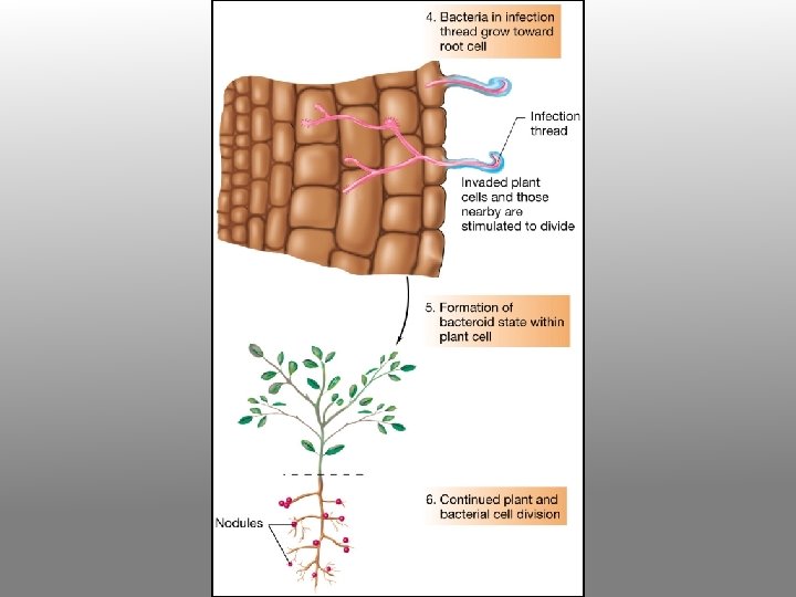 5. Infection thread penetrates through several layers of cortical cells and then ramifies within the cortex. Cells in advance of the thread divide and organize themselves into a nodule primordium. 6. The branched infection thread enters the nodule primordium zone and penetrates individual primordium cells. 7. Bacteria are released from the infection thread into the cytoplasm of the host cells, but remain surrounded by the peribacteroid membrane. Failure to form the PBM results in the activation of host defenses and/or the formation of ineffective nodules.
