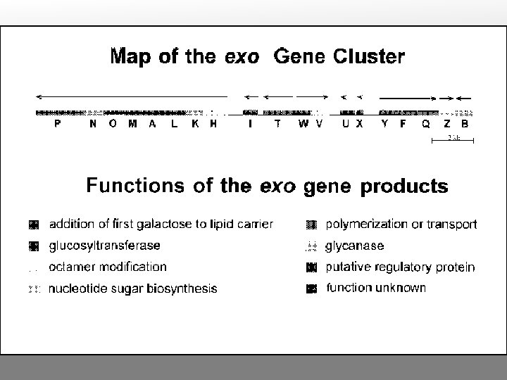 exo (exopolysaccharide) genes Encode proteins needed for exopolysaccharide synthesis and secretion In Rhizobium-legume interactions that lead to indeterminate nodules, exo mutants cannot invade the plant properly. However, they do provoke the typical plant cell division pattern and root deformation, and can even lead to nodule formation, although these are often empty (no bacteroids). In interactions that usually produce determinate nodules, exo mutations tend to have no effect on the process. Exopolysaccharides may provide substrate for signal production, osmotic matrix needed during invasion, and/or a recognition or masking function during invasion