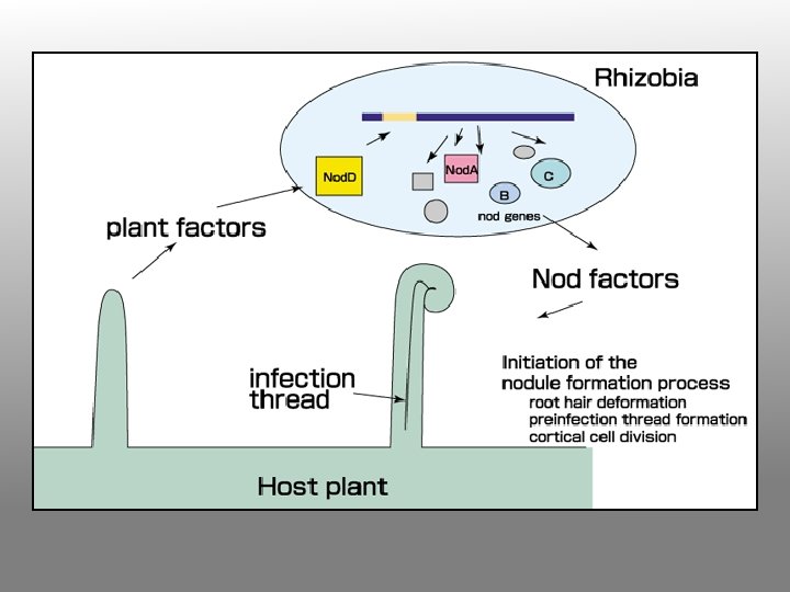 Host plant role in nodulation 1. Production and release of nod gene inducers - flavonoids 2. Activation of plant genes specifically required for successful nodule formation - nodulins 3. Suppression of genes normally involved in repelling microbial invaders - host defense genes
