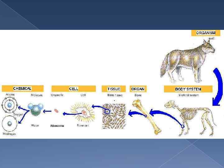 Organization levels Atom Molecule Organelle Cell Tissue Organ Body system Organism