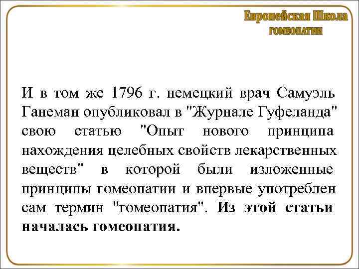 И в том же 1796 г. немецкий врач Самуэль Ганеман опубликовал в "Журнале Гуфеланда" свою статью "Опыт нового принципа нахождения целебных свойств лекарственных веществ" в которой были изложенные принципы гомеопатии и впервые употреблен сам термин "гомеопатия". Из этой статьи началась гомеопатия.