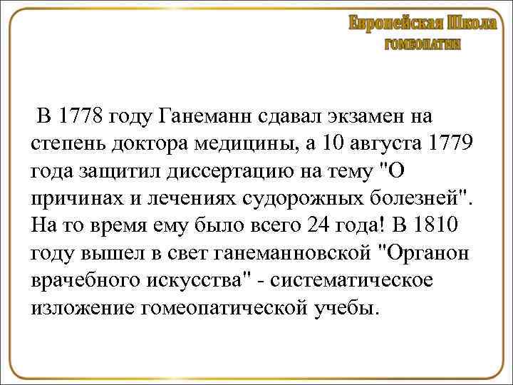 В 1778 году Ганеманн сдавал экзамен на степень доктора медицины, а 10 августа 1779 года защитил диссертацию на тему "О причинах и лечениях судорожных болезней". На то время ему было всего 24 года! В 1810 году вышел в свет ганеманновской "Органон врачебного искусства" - систематическое изложение гомеопатической учебы.
