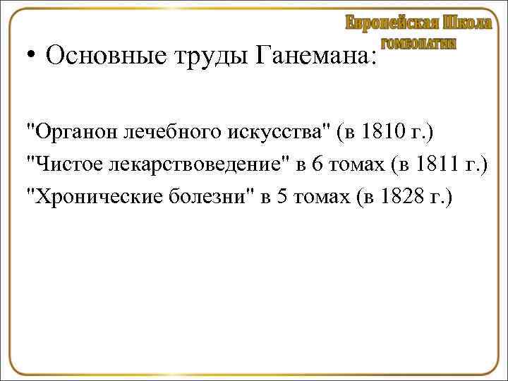 • Основные труды Ганемана: "Органон лечебного искусства" (в 1810 г. ) "Чистое лекарствоведение" в 6 томах (в 1811 г. ) "Хронические болезни" в 5 томах (в 1828 г. )