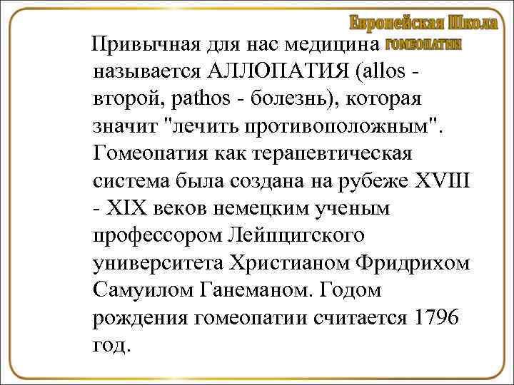 Привычная для нас медицина называется АЛЛОПАТИЯ (allos - второй, pathos - болезнь), которая значит "лечить противоположным". Гомеопатия как терапевтическая система была создана на рубеже XVIII - XIX веков немецким ученым профессором Лейпцигского университета Христианом Фридрихом Самуилом Ганеманом. Годом рождения гомеопатии считается 1796 год.