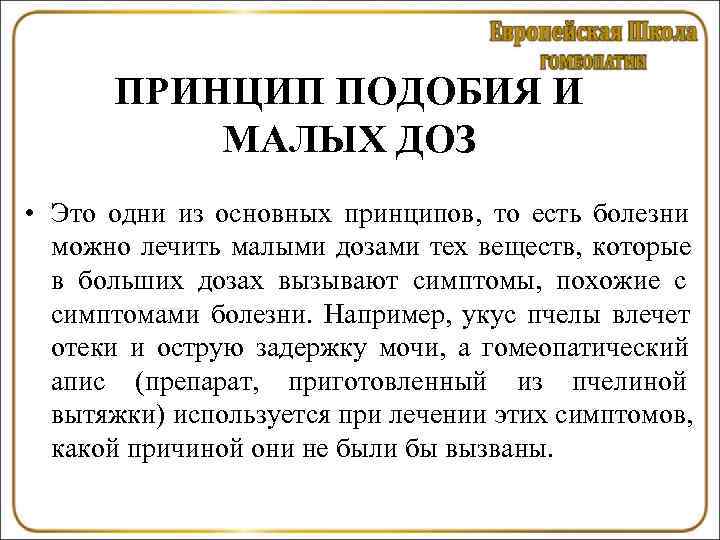 ПРИНЦИП ПОДОБИЯ И МАЛЫХ ДОЗ • Это одни из основных принципов, то есть болезни можно лечить малыми дозами тех веществ, которые в больших дозах вызывают симптомы, похожие с симптомами болезни. Например, укус пчелы влечет отеки и острую задержку мочи, а гомеопатический апис (препарат, приготовленный из пчелиной вытяжки) используется при лечении этих симптомов, какой причиной они не были бы вызваны.