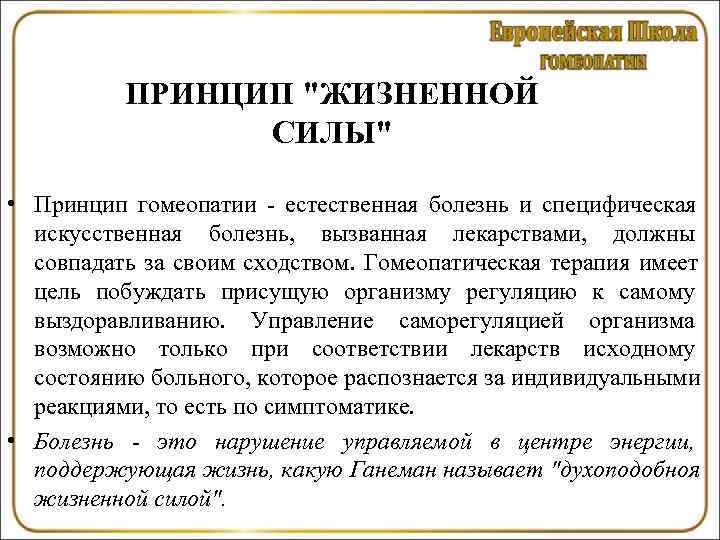ПРИНЦИП "ЖИЗНЕННОЙ СИЛЫ" • Принцип гомеопатии - естественная болезнь и специфическая искусственная болезнь, вызванная лекарствами, должны совпадать за своим сходством. Гомеопатическая терапия имеет цель побуждать присущую организму регуляцию к самому выздоравливанию. Управление саморегуляцией организма возможно только при соответствии лекарств исходному состоянию больного, которое распознается за индивидуальными реакциями, то есть по симптоматике. • Болезнь - это нарушение управляемой в центре энергии, поддержующая жизнь, какую Ганеман называет "духоподобноя жизненной силой".