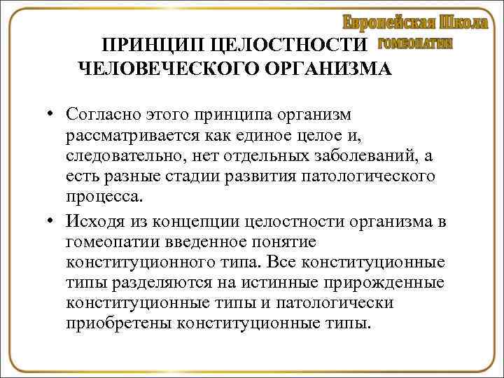 ПРИНЦИП ЦЕЛОСТНОСТИ ЧЕЛОВЕЧЕСКОГО ОРГАНИЗМА • Согласно этого принципа организм рассматривается как единое целое и, следовательно, нет отдельных заболеваний, а есть разные стадии развития патологического процесса. • Исходя из концепции целостности организма в гомеопатии введенное понятие конституционного типа. Все конституционные типы разделяются на истинные прирожденные конституционные типы и патологически приобретены конституционные типы.
