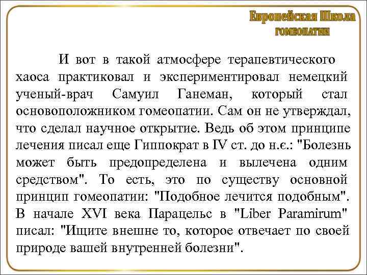 И вот в такой атмосфере терапевтического хаоса практиковал и экспериментировал немецкий ученый-врач Самуил Ганеман, который стал основоположником гомеопатии. Сам он не утверждал, что сделал научное открытие. Ведь об этом принципе лечения писал еще Гиппократ в IV ст. до н. є. : "Болезнь может быть предопределена и вылечена одним средством". То есть, это по существу основной принцип гомеопатии: "Подобное лечится подобным". В начале XVI века Парацельс в "Liber Paramirum" писал: "Ищите внешне то, которое отвечает по своей природе вашей внутренней болезни".