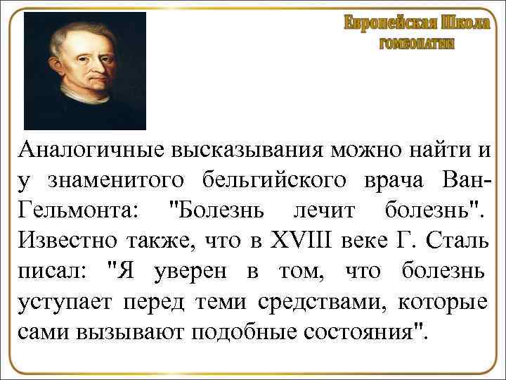 Аналогичные высказывания можно найти и у знаменитого бельгийского врача Ван- Гельмонта: "Болезнь лечит болезнь". Известно также, что в XVIII веке Г. Сталь писал: "Я уверен в том, что болезнь уступает перед теми средствами, которые сами вызывают подобные состояния".