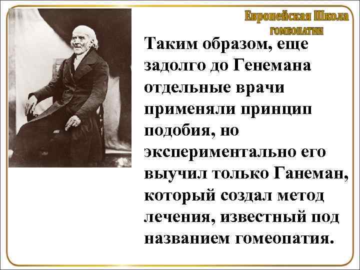 Таким образом, еще задолго до Генемана отдельные врачи применяли принцип подобия, но экспериментально его выучил только Ганеман, который создал метод лечения, известный под названием гомеопатия.