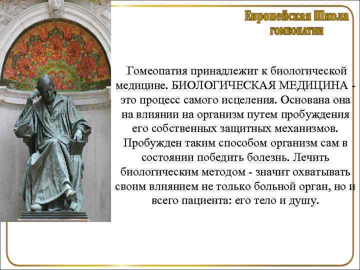 Гомеопатия принадлежит к биологической медицине. БИОЛОГИЧЕСКАЯ МЕДИЦИНА - это процесс самого исцеления. Основана она на влиянии на организм путем пробуждения его собственных защитных механизмов. Пробужден таким способом организм сам в состоянии победить болезнь. Лечить биологическим методом - значит охватывать своим влиянием не только больной орган, но и всего пациента: его тело и душу.