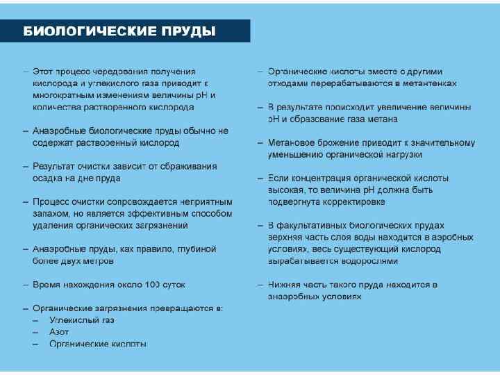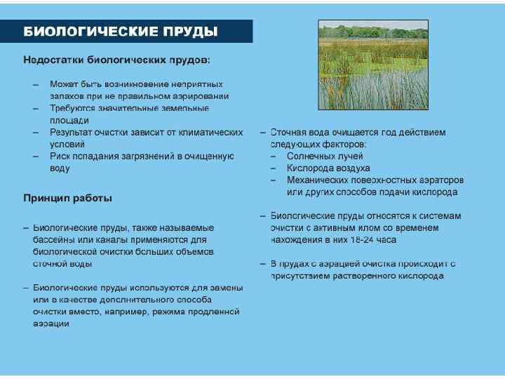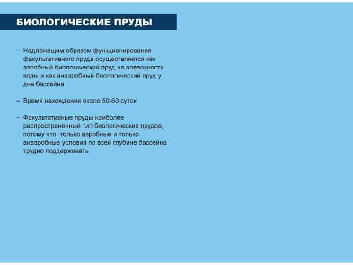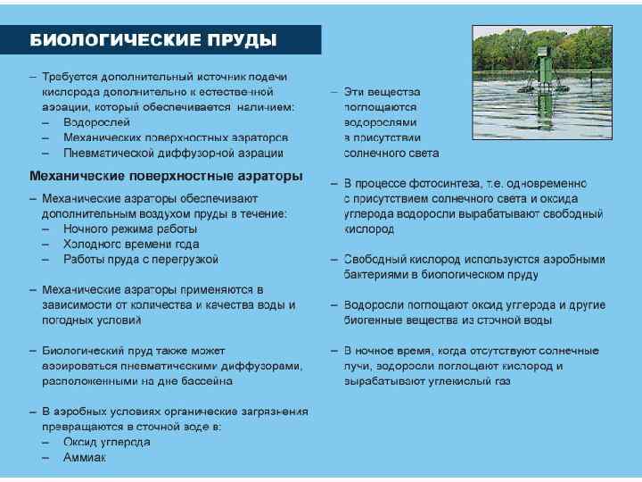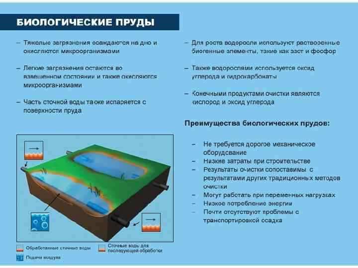 Биопруды - естественные или искусственно созданные пруды, в которых осуществляется очистка или доочистка предварительно очищенных сточных вод. Снижение БПК от 15 до 3 мг/л, что позволяет сбрасывать СВ в водные объекты.