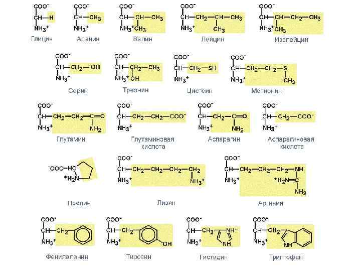 Мономерами белков служат α-аминокислоты L-ряда, общим признаком которых является наличие карбоксильной группы и аминогруппы у второго углеродного атома. В образовании белков участвуют 20 аминокислот, их называют протеиногенными аминокислотами.