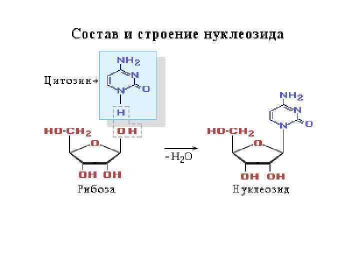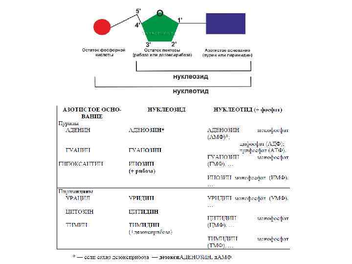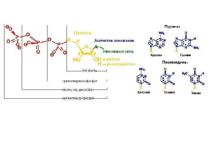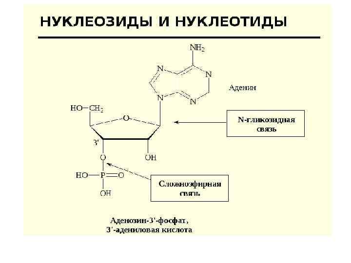 Нуклеиновые кислоты — биополимеры, мономерами которых являются нуклеотиды. Нуклеотид состоит из азотистого основания (АО), сахара (пентозы) и остатков фосфорной кислоты. Нуклеозид = АО + пентоза (рибоза или дезоксирибоза). Пентоза присоединяется N -гликозидной связью. Нумерация атомов: в АО нумеруют 1, 2, 3 и т. д. , в пентозе — 1/, 2/, 3/, и т. д. Нуклеотид = нуклеозид + 1– 3 остатка H 3 PO 4.