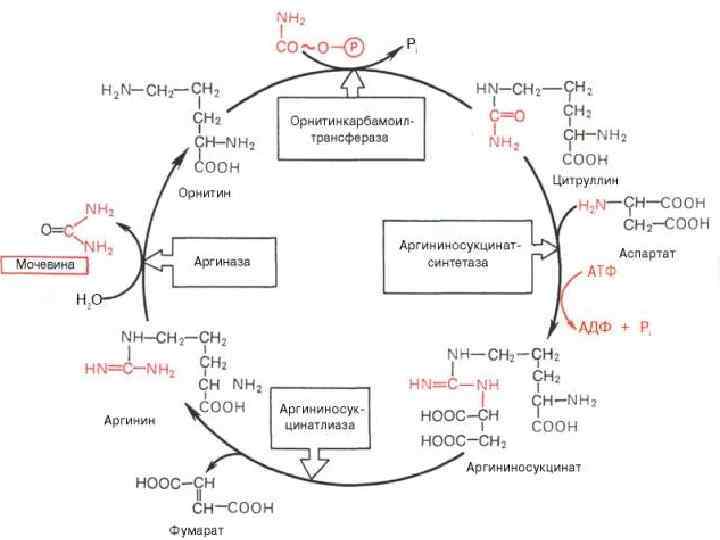 3. Синтез мочевины в печени карбамоилфосфат- O OH синтетаза I (митох. ) ║ ׀ NH 3 + HCO 3 + 2 АТФ + H 2 O → NH 2–C–O~P=O + 2 АДФ + Фн N-ацетилглу ׀ биотин OH карбамоилфосфат