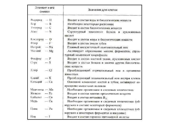 Макроэлементы. Микроэлементы. Ультрамикроэлементы Элемент Кислород Углерод Водород Азот Фосфор Калий Сера Хлор Количество % 65 – 75 15 – 18 8 – 10 1, 5 – 3 0, 2 – 1 0, 15 – 0, 4 0, 15 – 0, 2 0, 05 – 0, 1 Элемент Кальций Магний Натрий Железо Цинк Медь Йод Фтор Количество % 0, 04 – 2 0, 02 – 0, 03 0, 01 – 0, 015 0, 0003 0, 0002 0, 0001