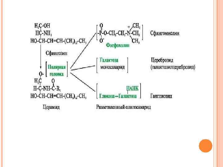 Существуют также липиды - производные аминоспирта сфингозина. В зависимости от строения полярной «головки» эти производные разделены на две группы фосфолипиды и гликолипиды. В зависимости от строения углеводной составляющей различают цереброзиды и ганглиозиды.