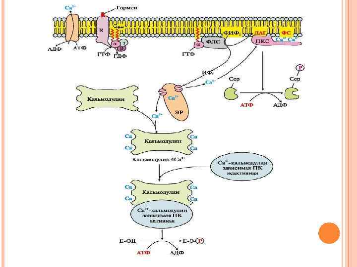 Са 2+ по градиенту концентрации поступает в цитозоль. В отсутствие ИФ 3 в цитозоле канал закрыт. При повышении концентрации кальция он активно присоединяется к белку кальмодулину, образуя комплекс 4 Са 2+кальмодулин. Этот комплекс взаимодействует с Са 2+кальмодулинзависимыми протеинкиназами и повышает их активность.