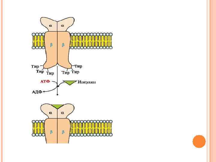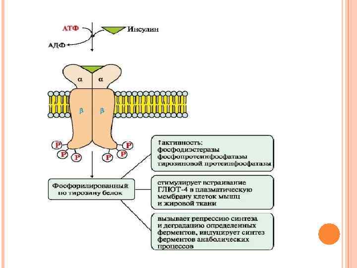 СТРОЕНИЕ РЕЦЕПТОРА ИНСУЛИНА в состав рецептора входят две α- и две βсубъединицы. α -Субъединицы расположены на наружной поверхности клеточной мембраны, βсубъединицы пронизывают мембранный бислой. Центр связывания инсулина образован Nконцевыми доменами а-субъединиц. Каталитический центр рецептора находится на внутриклеточных доменах β-субъединиц. Цитозольная часть рецептора имеет несколько остатков тирозина, которые могут фосфорилироваться и дефосфорилироваться.