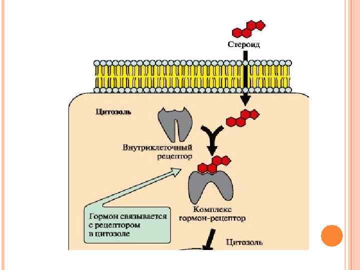 ПЕРЕДАЧА СИГНАЛА С ПОМОЩЬЮ ВНУТРИКЛЕТОЧНЫХ РЕЦЕПТОРОВ Гидрофобные по химической природе гормоны (стероидные гормоны и тироксин) могут диффундировать через мембраны, поэтому их рецепторы находятся в цитозоле или ядре клетки. Гормон проходит через двойной липидный слой клеточной мембраны. В цитозоле или ядре гормон взаимодействует с рецептором.