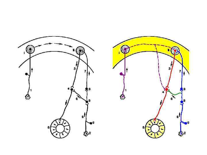 Учебник С. 260 Физиологический механизм, лежащий в основе условного рефлекса, схематически представлен на рис. 15. 1. Рис. 15. 1. Образование условного рефлекса (схема). I, II — очаги возбуждения в коре большого мозга; 1 — афферентные пути условного сигнала; 2 — рецепторы полости рта; 3 — эфферентные пути; 4 — центр в продолговатом мозге; 5 — слюнная железа; 6, 7 — афферентные пути безусловного сигнала; 8 — чувствительные нейроны; 9 — вставочные нейроны.
