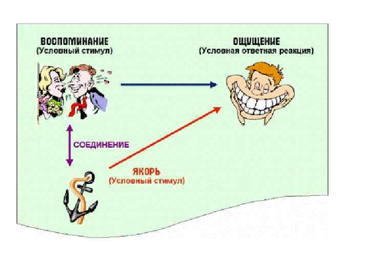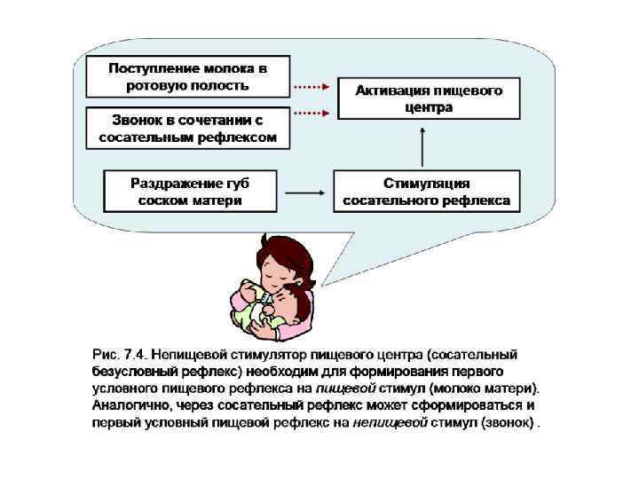 Учебник С. 260 261 • В зоне коркового представительства условного стимула и коркового (или подкоркового) представительства безусловного стимула формируются два очага возбуждения. Очаг возбуждения, вызванный безусловным стимулом внешней или внутренней среды организма, как более сильный (доминантный) притягивает к себе возбуждение из очага более слабого возбуждения, вызванного условным стимулом. После нескольких повторных предъявлений условного и безусловного раздражителей между этими двумя зонами «проторяется» устойчивый путь движения возбуждения: от очага, вызванного условным стимулом, к очагу, вызванному безусловным стимулом. В результате изолированное предъявление только условного стимула теперь приводит к реакции, вызываемой ранее безусловным стимулом.