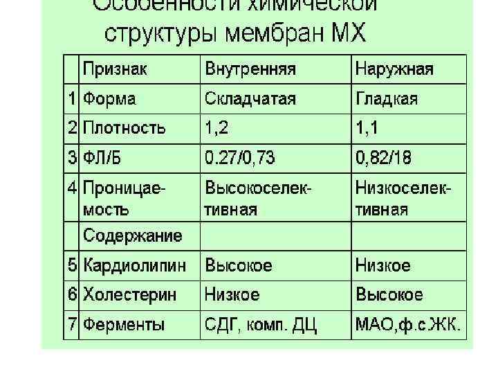 Особенности химической структуры мембран МХ Признак Внутренняя Наружная 1 Форма Складчатая Гладкая 2 Плотность 1, 2 1, 1 3 ФЛ/Б 0. 27/0, 73 0, 82/18 4 Проницаемость Содержание Высокоселективная Низкоселективная 5 Кардиолипин Высокое Низкое 6 Холестерин Низкое Высокое 7 Ферменты СДГ, комп. ДЦ МАО, ф. с. ЖК.