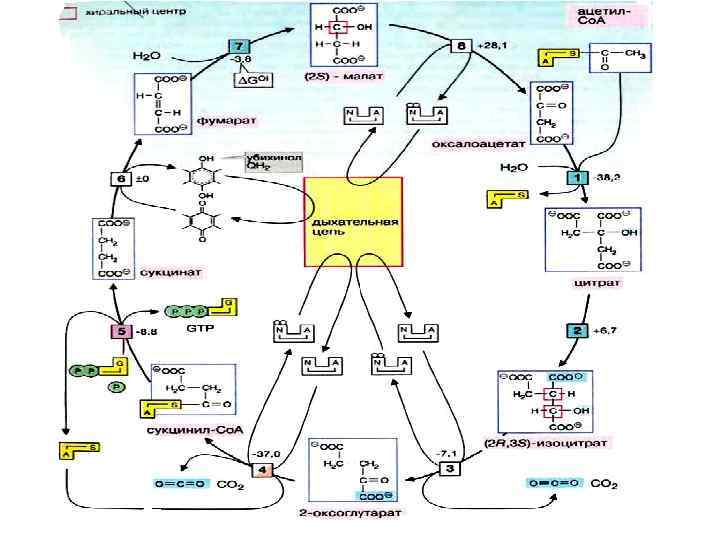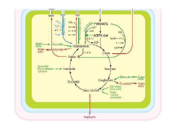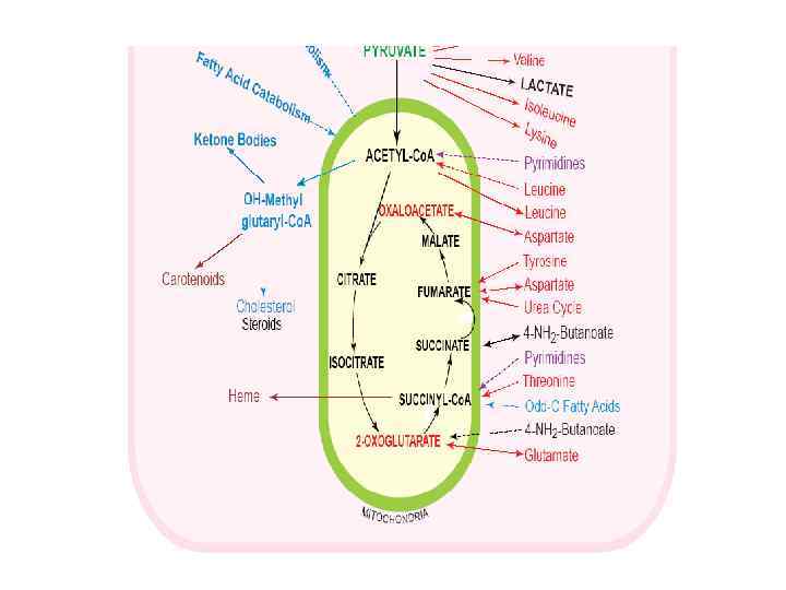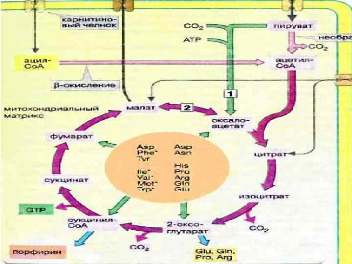 2. Пластическая функция. Поскольку ЦТК «питается» субстратами различного происхождения, то он может быть источником углеродных скелетов для различных веществ. ЩУК Цитрат синтез ЖК, т. е. избыток углеводов депонируется в виде нейтрального жира. Сукцинил Ко. А синтез ГЛУ, АРГ, ПРО, ГИС. a-кетоглутарат синтез гема (Hb, цитохромы, каталаза, пероксидаза). ГНГ (образование Гл из неуглеводных компонентов