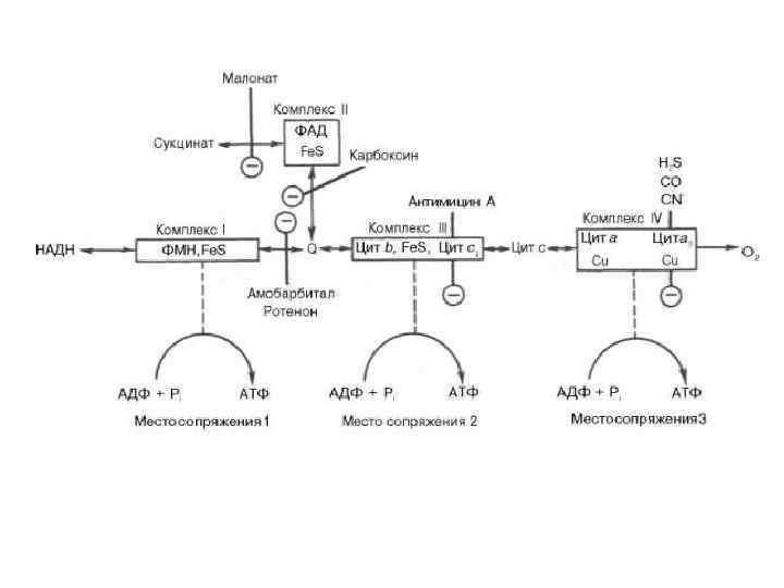 Ингибиторы тканевого дыхания Разобщители тканевого дыхания и окислительного фосфорилирования Ингибиторы синтеза АТФ Амобарбитал, ротенон, антимизин, цианиды 2, 4 -динитрофенол, жирные кислоты, дикумарин и его производные, тироксин Антибиотики олигомицин, рутамицин Ионофоры: Валиномицин, грамицидин