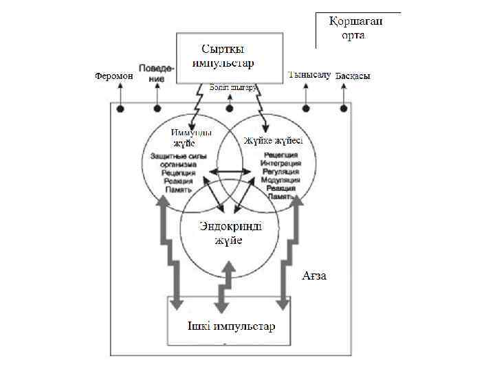 • Иммундық жүйе мен орталық жүйке жүйесінің арасындағы байланыс қан арқылы цитокиндер көмегімен жүзеге асады. • Орталық жүйке жүйесі иммундық жүйеге нейропептидтер көмегімен әсер етеді. ЦНС воздействует на иммунную систему с помощью нейропептидов. • Ішкі секреция бездеріне сәйкес әсер ете отырып орталық жүйке жүйесі тікелей эндокринді жүйенің жұмысын реттейді. • Эндокринді жүйе иммунды жүйеге адреналды осьті гипоталамо -гипофизарлы гормон көмегімен әсер етеді. • Иммунокомпетентные клетки способны продуцировать ряд гормонов, прежде всего кортикотропин, эндорфин, энкефалин. • Нейрондар тікелей интерлейкин өнімдерін қабілетті. способны напрямую продуцировать интерлейкины.