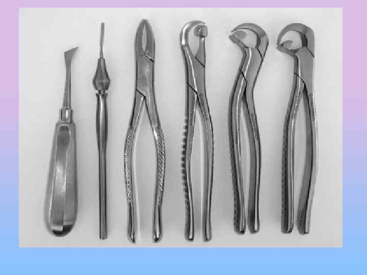 Для экстракции (удаления) зубов в стоматологии используются следующие инструменты: элеваторы, периотомы, щипцы и физиологические щипцы. Дентальные элеваторы и периотомы используют механическое преимущество клина, чтобы начать люксацию зуба для его удаления, когда они вдавливаются вдоль корня зуба. Элеватор может действовать как рычаг, чтобы поднять зуб из лунки, когда край кости используется как точка опоры. Дентальные щипцы фактически являются двумя рычагами 1 -го рода, соединенными в основании стержнем. Сила прикладывается на ручки (длинные стороны рычага), клювы накладываются на зуб – короткая сторона рычага, стержень действует как точка опоры.