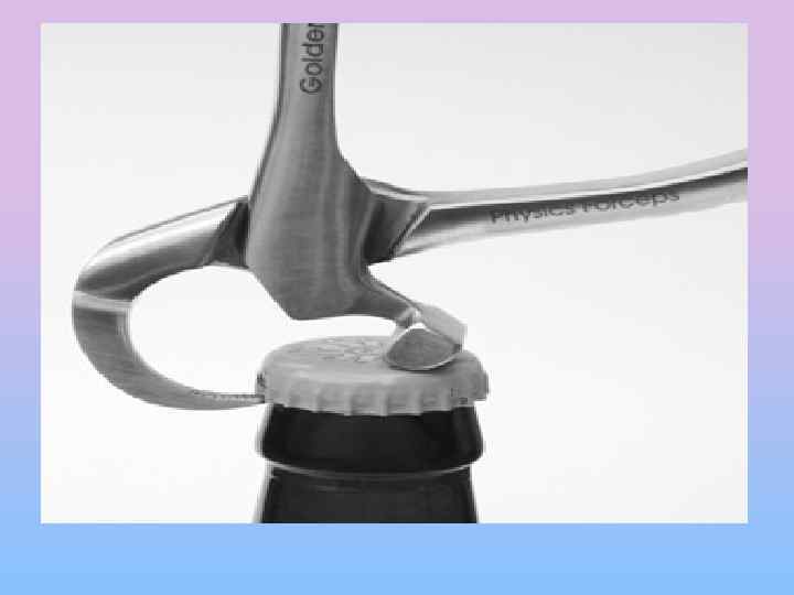 Экстракция зубов и простейшие механизмы История удаления зубов относится ко временам Аристотеля (384 – 322 до н. э. ), когда он описал механику щипцов для удаления: преимущество « 2 -х рычагов, действующих в противоположных направлениях и имеющих одну точку опоры» . Простейший механизм – устройство, дающее выигрыш в силе: клин, рычаг, колесо, винт, шкив. Эти устройства передают или изменяют силу или вращающий момент. Наиболее простые инструменты, используемые для извлечения зубов, - клин и рычаг. Клин – простой механизм в виде призмы, рабочие поверхности которого сходятся под острым углом, используется для раздвижения, разделения на части обрабатываемого предмета. Идеальный выигрыш в силе, даваемый клином, равен отношения его длины к толщине на тупом конце. Клин изменяет направление действия силы.