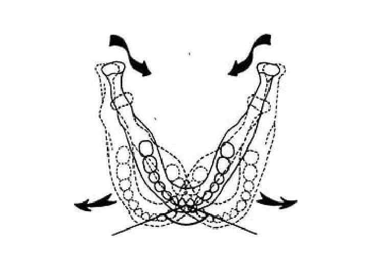 Движения нижней челюсти 2. Сагиттальные движения: выдвижение НЧ вперёд Мышцы: латеральные крыловидные. ВНЧС: 1 фаза: скольжение диска и головки НЧ по поверхности суставного бугорка 2 фаза: добавляется шарнирное движение (вокруг поперечной оси)