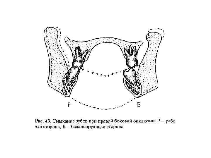При боковых движениях НЧ различают: • Рабочую сторону – зубы устанавливаются друг против друга одноимёнными бугорками. • Балансирующую сторону – разноимёнными или не смыкаются.
