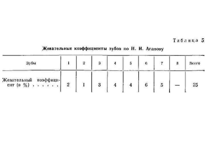 Жевательная эффективность по Агапову • Жевательная эффективность всего зубного аппарата – 100% • Единица жевательной способности и выносливости пародонта – боковой резец. С ним сравниваются остальные зубы. • Каждый зуб имеет свой жевательный коэффициент.