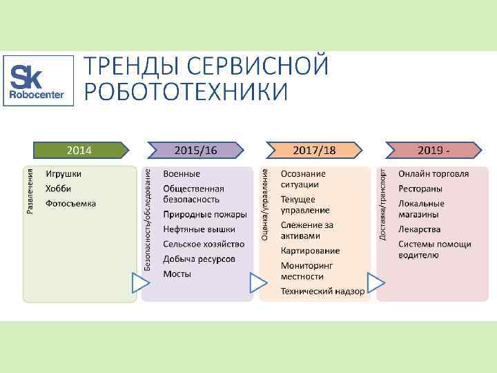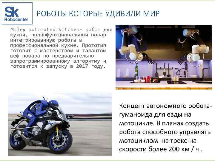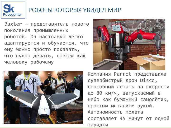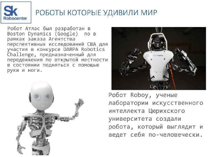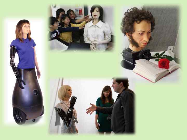 Антропоморфные роботы • Роботы-секретари, выполняющие рутинную работу по встрече новых посетителей и их знакомству с фирмой • Роботы-официанты в робокафе • Выставочные роботы или продавцы, рассказывающие о продукции или сервисах фирмы на выставке • Роботы для проведения уроков, например, робот-Пушкин для уроков литературы, робот-Петр I для уроков истории • Роботы для реабилитации детей, больных аутизмом, или детей-инвалидов для дистанционного посещения школы • Роботы-медсёстры, приветливо встречающие пациентов и без устали наблюдающие за ними в палатах 24 часа в сутки • Робот-копия с портретным сходством – эксклюзивный подарок шефу, партнеру, другу, или себе.