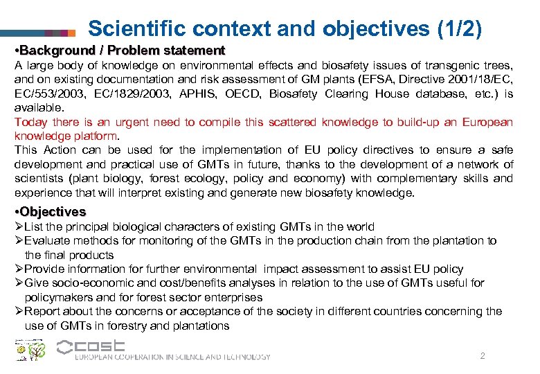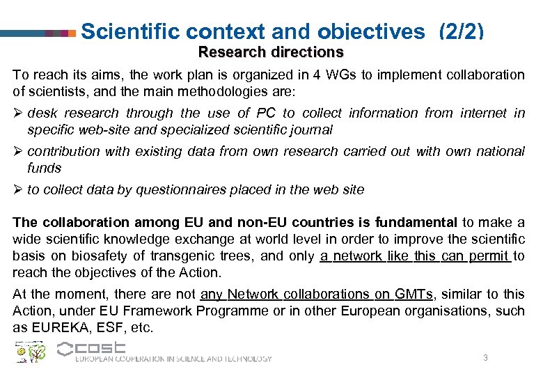 Scientific context and objectives (1/2) • Background / Problem statement A large body of knowledge on environmental effects and biosafety issues of transgenic trees, and on existing documentation and risk assessment of GM plants (EFSA, Directive 2001/18/EC, EC/553/2003, EC/1829/2003, APHIS, OECD, Biosafety Clearing House database, etc. ) is available. Today there is an urgent need to compile this scattered knowledge to build-up an European knowledge platform. This Action can be used for the implementation of EU policy directives to ensure a safe development and practical use of GMTs in future, thanks to the development of a network of scientists (plant biology, forest ecology, policy and economy) with complementary skills and experience that will interpret existing and generate new biosafety knowledge. • Objectives ØList the principal biological characters of existing GMTs in the world ØEvaluate methods for monitoring of the GMTs in the production chain from the plantation to the final products ØProvide information for further environmental impact assessment to assist EU policy ØGive socio-economic and cost/benefits analyses in relation to the use of GMTs useful for policymakers and forest sector enterprises ØReport about the concerns or acceptance of the society in different countries concerning the use of GMTs in forestry and plantations 2