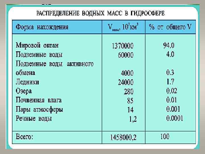 ГИДРОСФЕРА Гидросфера – водная оболочка Земли. 94% объёма воды составляют воды Мирового океана и около 7% воды внутренних водоёмов. Структурно водоёмы подразделены на бенталь (область дна) и пелагиаль( область толщи воды) Жизнь в гидросфере распространена по всей её толщине , до глубины 11000 м. Все организмы гидробионты подразделяются на виды связанные с дном – бентос, и –живущие в толще воды - пелагос.