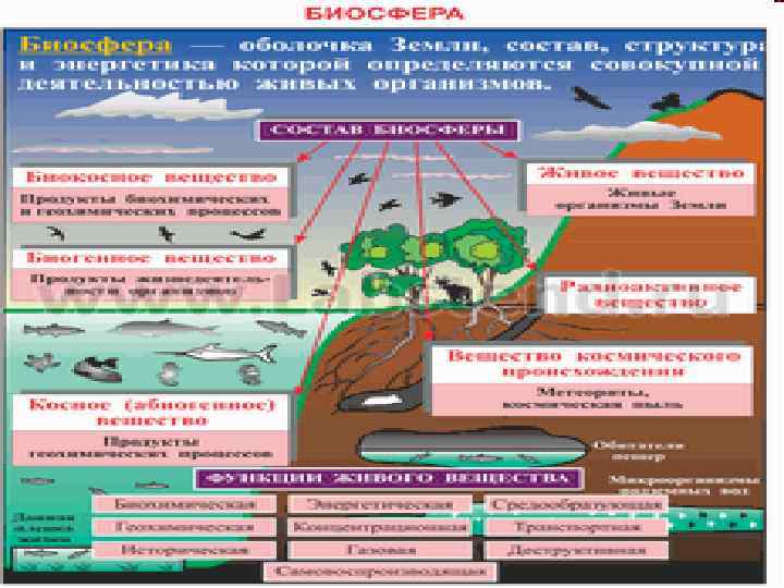 • Основная масса живого вещества сосредоточена в зоне пересечения трех геологических оболочек планеты: атмосферы, гидросферы (океаны, моря, реки и пр. ) и литосферы (поверхностный слом пород). • К неживому веществу биосферы относится составная часть этих оболочек, связанная с живым веществом циркуляцией вещества и энергии.