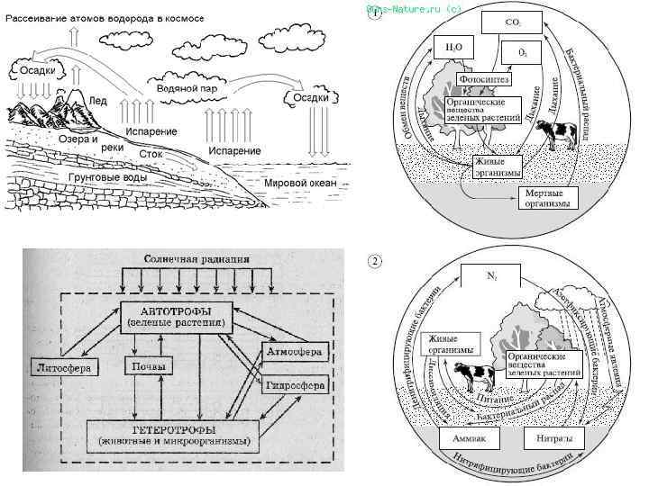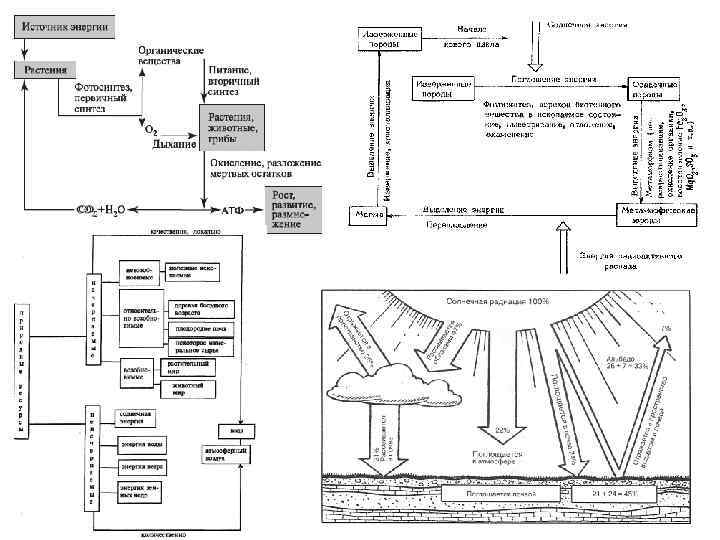 • Биогеохимический круговорот — важнейший процесс, проходящий в биосфере. Благодаря ему происходит взаимосвязь всех оболочек Земли, населенных живыми существами. • Сила, движущая могучий биогеохимический круговорот в биосфере, — солнечная энергия. Ее ежегодно на Землю поступает столько, что она во много раз превышает мощность любого другого источника энергии Земли. Земные растения улавливают эту энергию в процессе фотосинтеза, но менее 1% от поступающей. Хотя и это количество очень велико. Оно в 10 раз больше, чем энергия ядерных реакций в недрах планеты. В результате фотосинтеза в растениях образуются органические вещества, идущие на питание их, а часть органических веществ откладывается. Вместе с зеленой массой эта отложенная часть может переходить в организм животных (сначала травоядных, а потом хищных) и там частично распадаться до более простых химических соединений. После гибели растений и животных микроорганизмы заканчивают разрушение органического вещества, что создает питательную среду, в том числе почвы, для возрождения и следующего цикла развития биомассы.