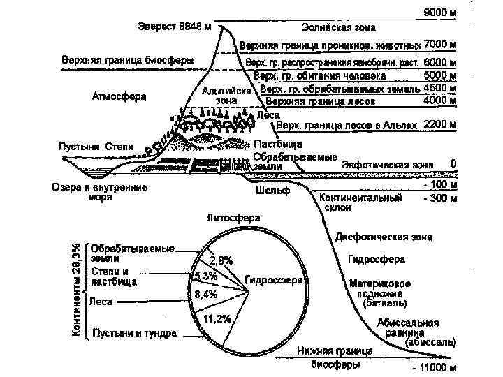 • верхняя граница биосферы проходит в тропосфере и совпадает с озоновым слоем Земли. Нижняя граница ее очень неровная. Биосфера включает в себя всю толщу гидросферы, а также верхнюю часть литосферы, мощностью около 4 км.