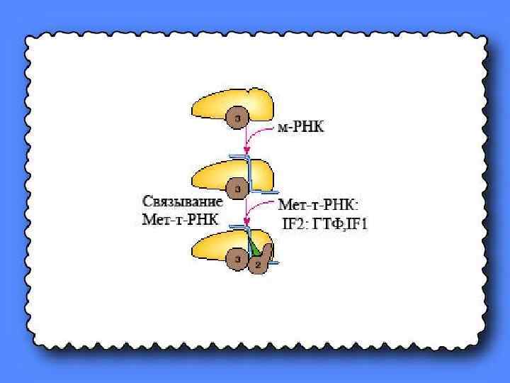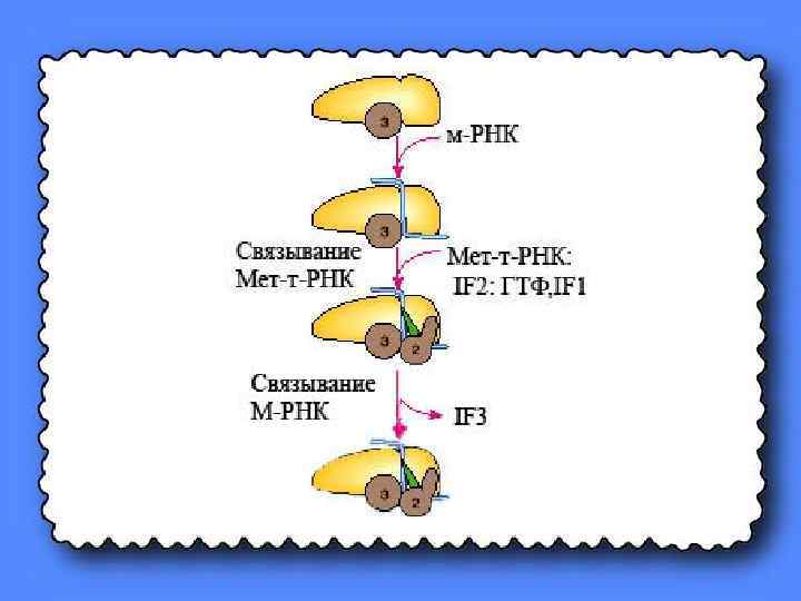 Присоединение IF 1, IF 2 формилметионил-т-РНК и ГТФ к 30 S субчастице осуществляется в виде комплекса. Как только оно произойдёт, к ней присоединяется м-РНК. Причём в результате взаимодействия антикодона формилметиониловой т-РНК с кодоном м-РНК предопределяется такое расположение м-РНК на рибосоме, которое обеспечивает дальнейшее считывание содержащейся в последовательности её нуклеотидных остатков информации о первичной структуре синтезируемого белка.