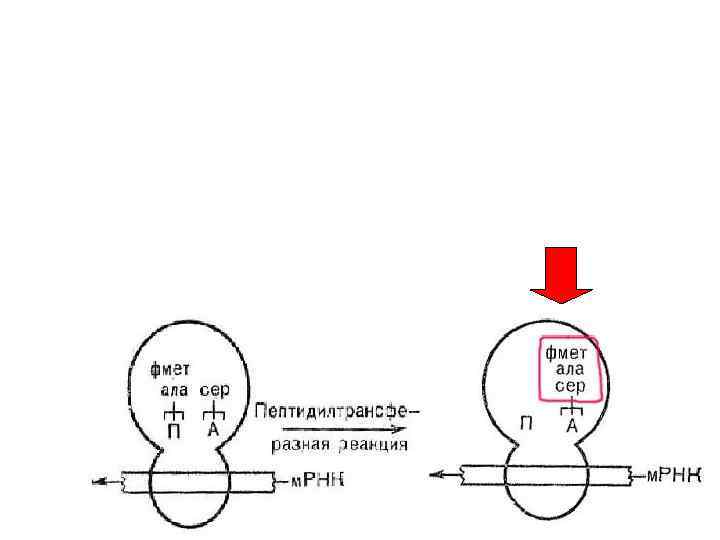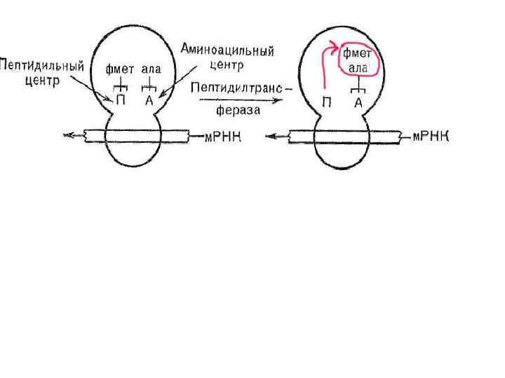 Формилметионил-т-РНК из аминоацильного центра перемещается в пептидильный центр рибосомы. У образовавшейся активной рибосомы 70 S, оказывается свободный аминоацильный центр, который может реагировать с определённой амино-ацил-т-РНК в строгом соответствии с очередным кодоном м -РНК.