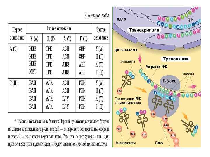 Триплетный код • Многие из 64 триплетных кодонов соответствуют одной и той же аминокислоте • Генетический код: словарь перевода с языка оснований на язык аминокислот. A — аденин, C — цитозин, G — гуанин, U — урацил (аналог тимина в ДНК)