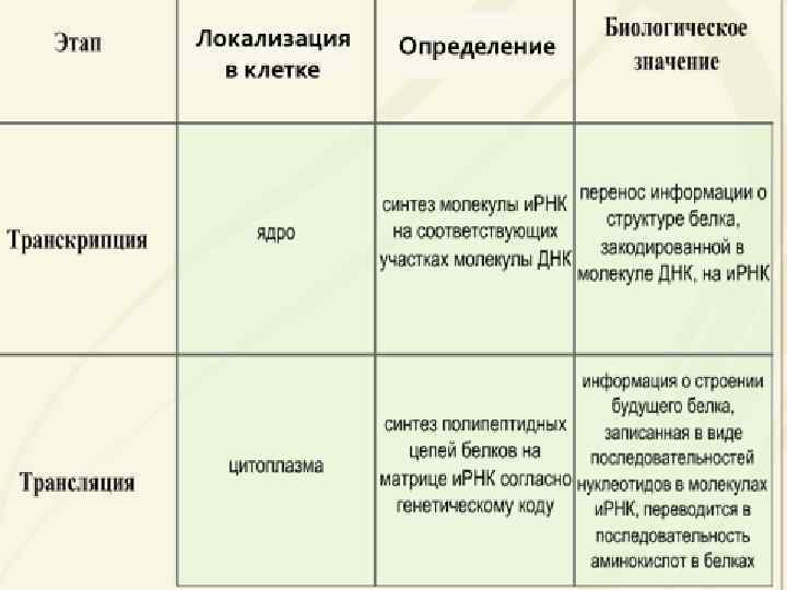 I этап - транскрипция Транскрипция ( «списывание» ) – процесс считывания информации о первичной структуре белка с молекулы ДНК молекулой и-РНК (синтез молекулы и-РНК на основе молекулы ДНК) *Во время транскрипции происходит перенос генетической информации с молекулы ДНК на и-РНК