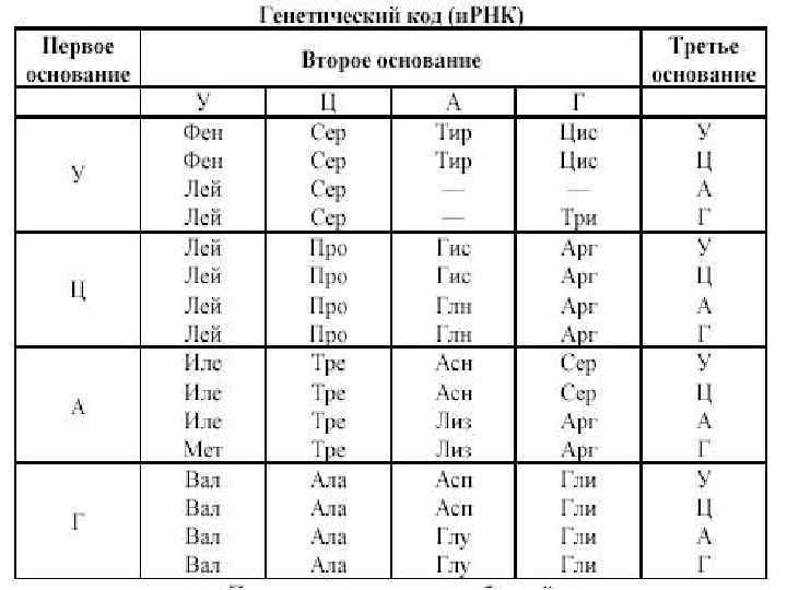 Генетический код Первое основание У(А) Второе основание Ц(Г) А(Т) Г(Ц) Третье основание У(А) Фен Лей Сер Сер Тир — — Цис — Три У(А) Ц(Г) А(Т) Г(Ц) Ц(Г) Лей Лей Про Про Гис Глн Арг Арг У(А) Ц(Г) А(Т) Г(Ц) А(Т) Иле Иле Мет Тре Тре Асн Лиз Сер Арг У(А) Ц(Г) А(Т) Г(Ц) Вал Вал Ала Ала Асп Глу Гли Гли У(А) Ц(Г)