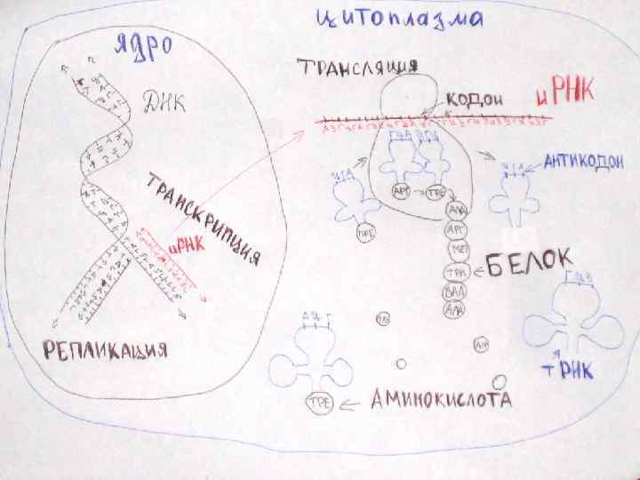 Биосинтез белка — сложный многостадийный процесс синтеза полипептидной цепи из аминокислотных остатков, происходящий на рибосомах клеток живых организмов с участием молекул м. РНК и т. РНК.