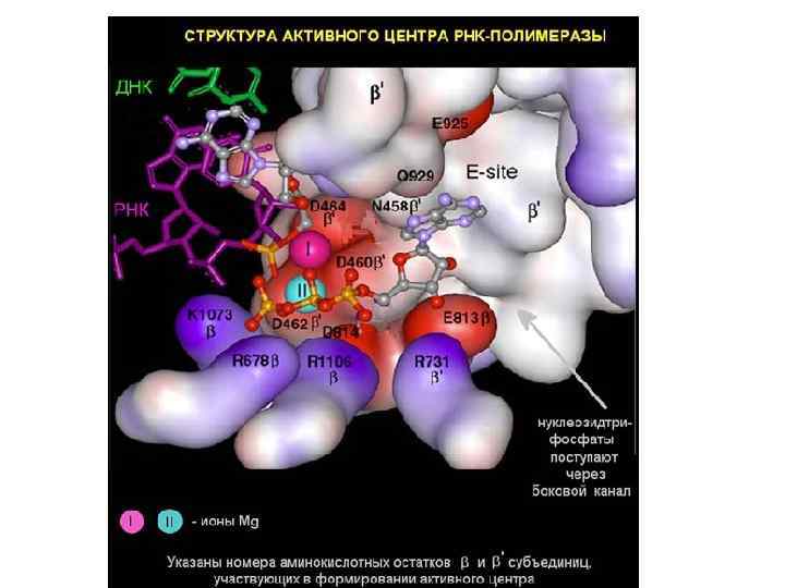 Кор-фермент состоит из α- и β-субъединиц. Они соединены так, что образуют как бы «пасть» или «клешню» . α-субъединицы находятся в основании этой «клешни» , и выполняют структурную функцию. С ДНК и РНК они, по-видимому, не взаимодействуют. ω-субъединица – небольшой белок, который также выполняет структурную функцию. Основная часть работы приходится на долю β- и β΄-субъединиц. Внутри «пасти» , которая называется главным каналом, находится активный центр фермента. Именно здесь происходит соединение нуклеотидов, образование новой связи при синтезе РНК. Главный канал в РНКполимеразе – это то место, где во время элонгации находится ДНК. Еще в этой структуре сбоку есть так называемый вторичный канал, по которому подаются нуклеотиды для синтеза РНК.