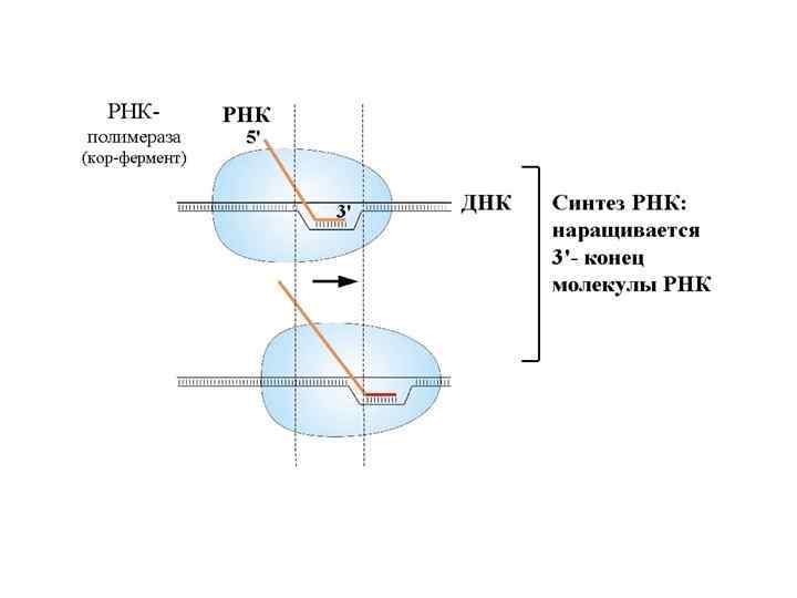 РНК-полимераза работает как молекулярная машина. Часть β΄субъединицы удерживает передний ДНК-дуплекс. Эта часть называется "заслонкой". После связывания с ДНК заслонка опускается, и зажимает ДНК так, чтобы она не могла выпасть в процессе транскрипции. Внутри находится активный центр РНК-полимеразы, где непосредственно происходит комплементарное взаимодействие поступившего по боковому каналу рибонуклеоиздтрифосфата с ДНК-матрицей. Если вновь прибывший нуклеотид комплементарен матрице, то он ферментативно пришивается к свободному 3' –концу РНК. В транслокации, то есть перемещении РНКполимеразы по нити ДНК, участвует α-спиральная структура, снизу вверх торчащая из β-субъединицы. В перемещении по ДНК участвует элемент РНКполимеразы F-спираль, которая при этом изгибается, перемещается вместе с комплексом РНК-ДНК, освобождается от них и опять выпрямляется.